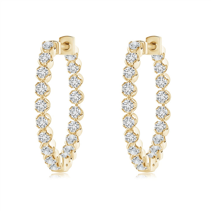 The Floating Diamond Inside-Out Hoop Earrings by Angara dazzle from every angle. Brilliant round diamonds are prong-set on both the inside and outside of these 14k yellow gold hinged hoops, creating a mesmerizing floating effect. This stunning design captures light beautifully, making these earrings a standout accessory for any occasion.
