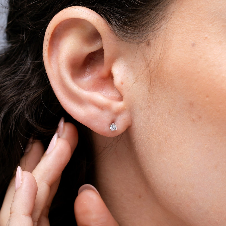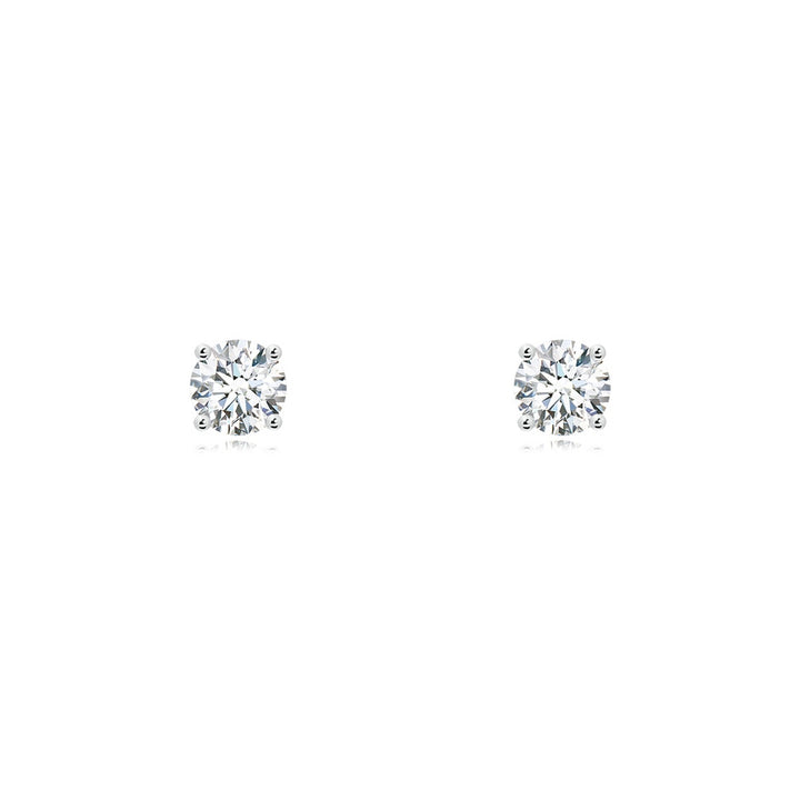 Crafted in 14k white gold with two round diamonds totaling 0.50 carat, G color, VS2 clarity. Four-prong basket setting with push back closure.