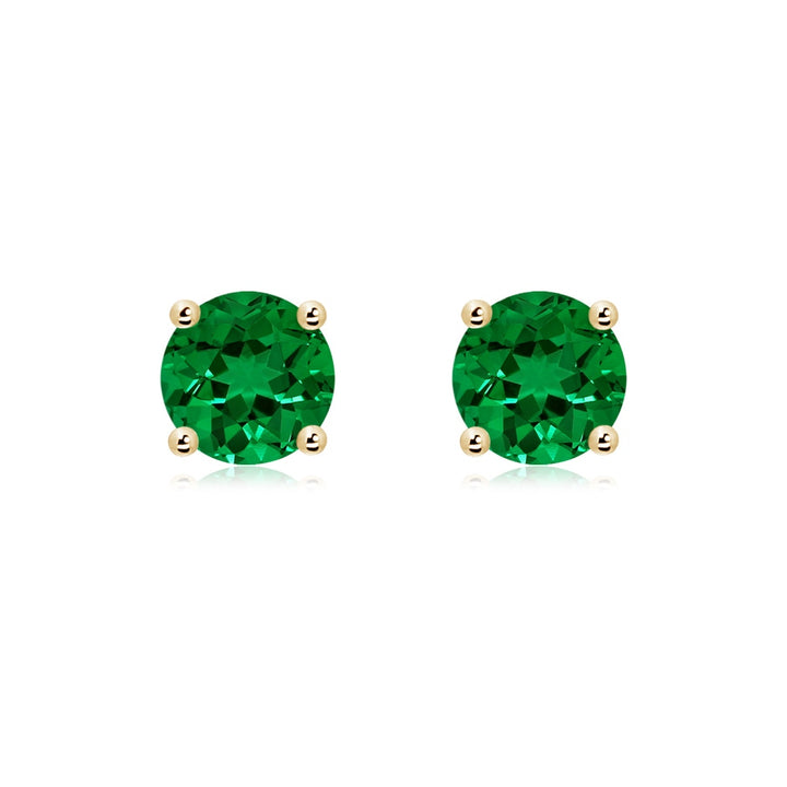 These Lab-Grown Round Emerald Stud Earrings by Angara showcase the lush green beauty of 7mm round lab-grown emeralds in basket-style prong settings set in 14k yellow gold. Their simple and elegant design makes them a versatile addition to any jewelry collection.
