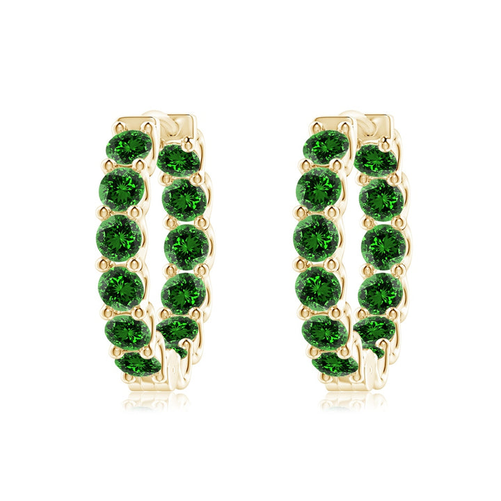 These Lab-Grown Prong-Set Round Emerald Inside Out Hinged Clip Hoop Earrings by Angara dazzle with vibrant green lab-grown emeralds set on 14k yellow gold hoops. The inside and outside prong settings maximize brilliance and color, combining timeless elegance with a fresh design. Perfect for lovers of refined craftsmanship and bold green hues.