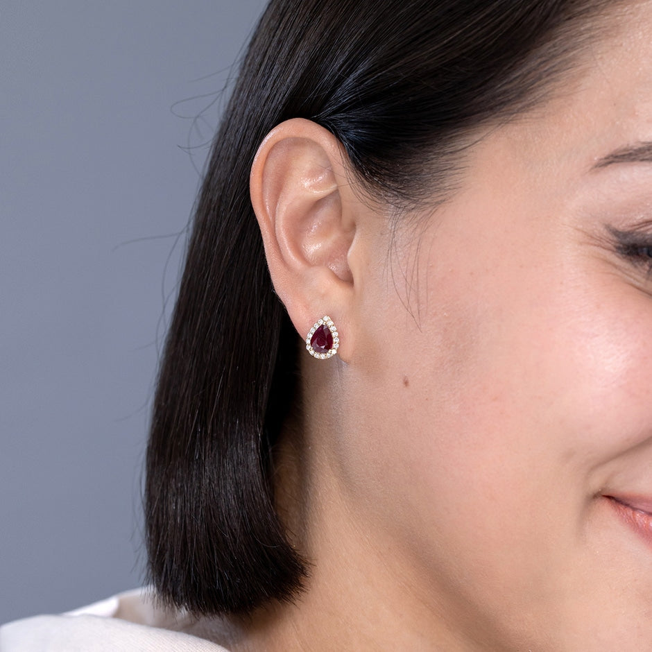 These Pear-Shaped Ruby Halo Stud Earrings by Angara sparkle with fiery elegance. The bold pear-shaped rubies are prong set amidst a halo of brilliant diamonds, all crafted in platinum for a luxurious finish. A perfect pair for adding vibrant color and classic glamour.