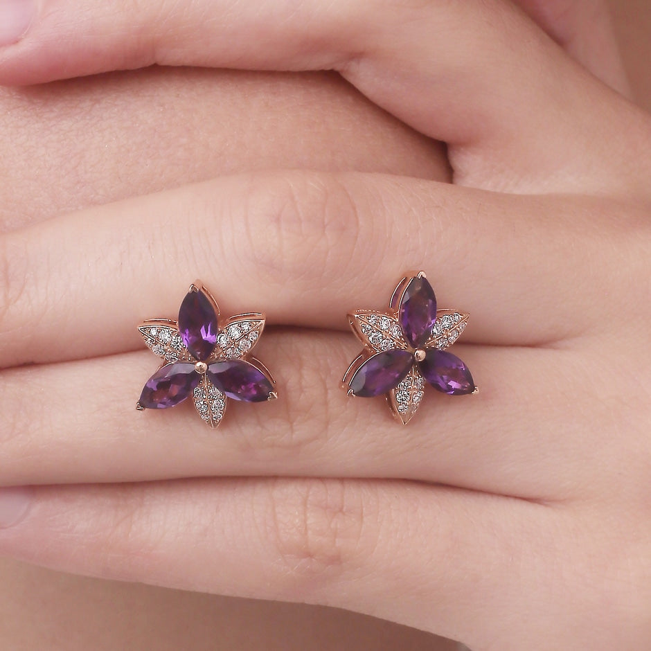 Amethyst and Diamond Trillium Flower Stud Earrings