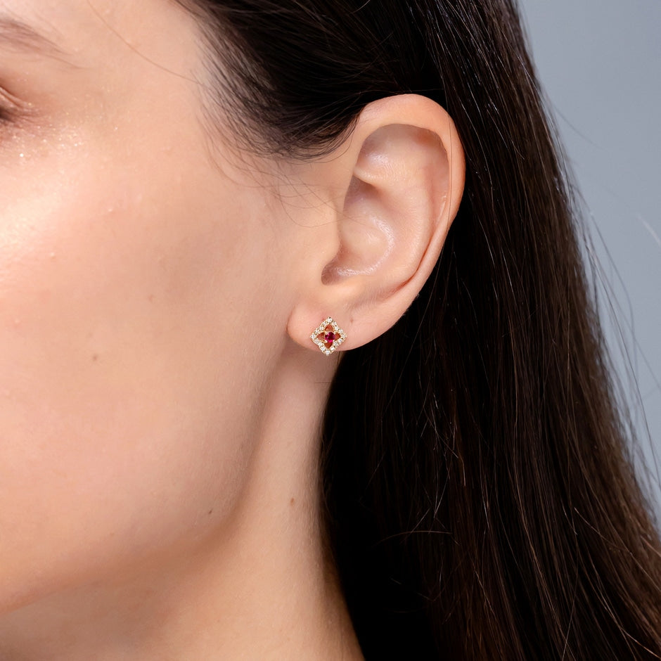 These Vintage Inspired Ruby Clover Stud Earrings by Angara evoke the charm of a bygone era with their delicate 18k yellow gold clover frames, encrusted with sparkling diamonds that beautifully surround vibrant AAAA-grade round rubies. This pair captures timeless elegance and symbolizes luck and love, making them a captivating addition to any jewelry collection.