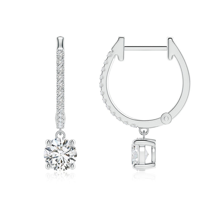 These Round Diamond Hoop Drop Earrings by Angara elevate your everyday elegance with a modern twist. Crafted in 14k white gold, they feature a graceful hoop silhouette adorned with 24 pavé-set round diamonds that add a subtle sparkle. At the drop, two larger prong-set round diamonds captivate with their brilliance. These earrings strike the perfect balance between refined luxury and statement allure, ideal for dressing up any look or adding a sophisticated edge to casual ensembles.