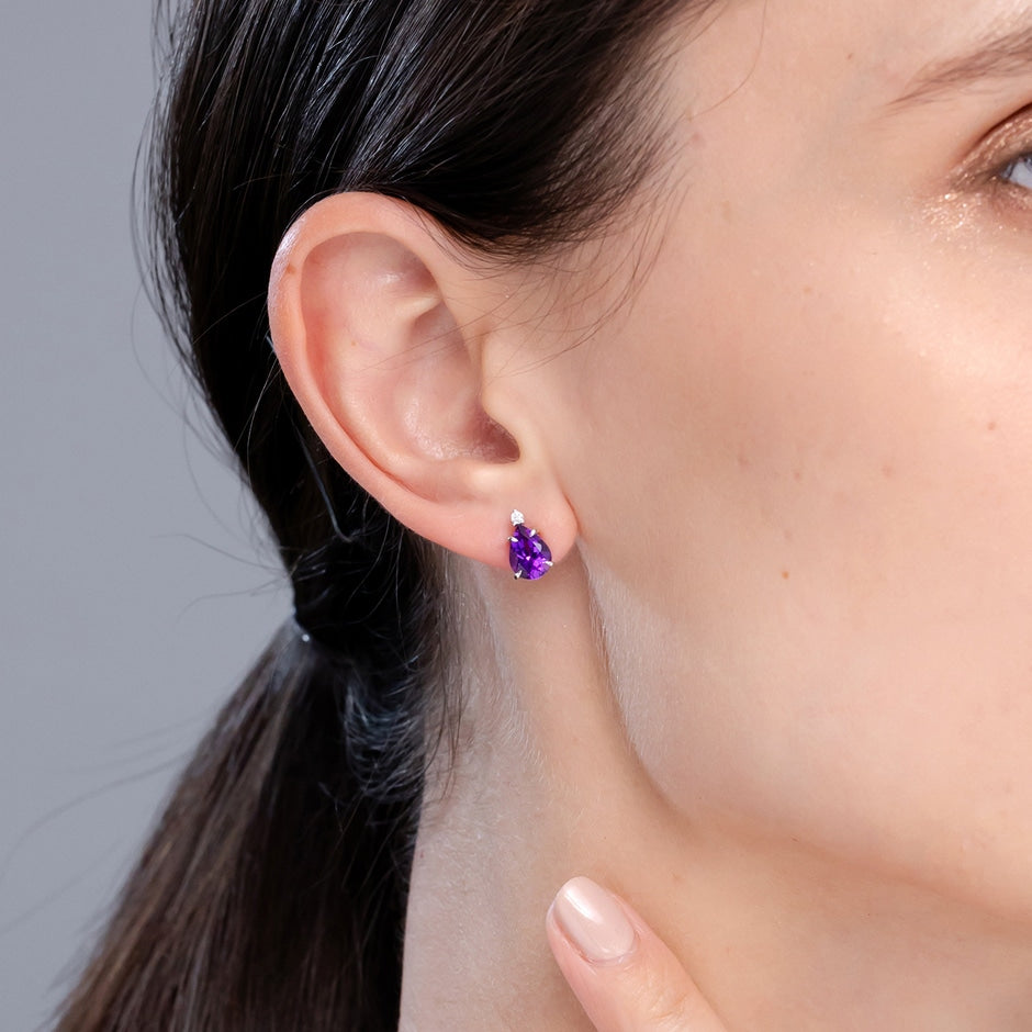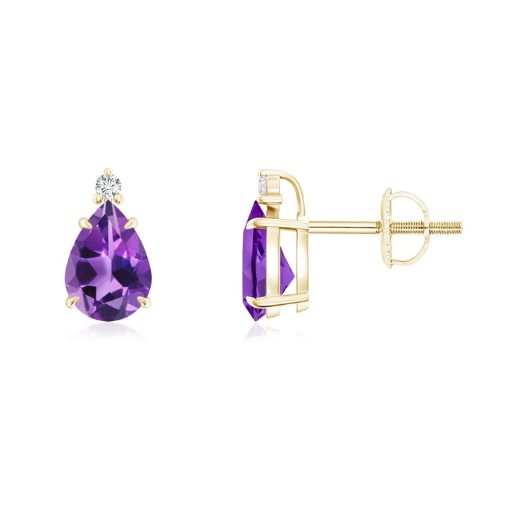 These Classic Claw-Set Pear Amethyst Solitaire Stud Earrings by Angara capture the allure of deep purple hues with elegant sparkle. Set in 14k yellow gold, the inverted pear-shaped AAA-grade amethysts are prong-set and topped with small round diamonds totaling 0.03 ct for added brilliance. These studs are perfect for adding a regal touch to everyday style.