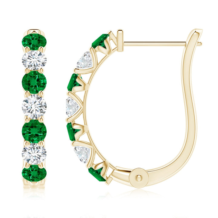 These Prong-Set Lab-Grown Emerald and Diamond Huggie Hoop Earrings by Angara combine lush green lab-grown emeralds and brilliant lab-grown diamonds in an alternating prong-set pattern. Crafted in 18k yellow gold with hinged clip closures, these hoops offer sophisticated sparkle and sustainable luxury for everyday wear or special occasions.