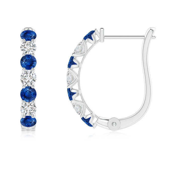 These Prong-Set Blue Sapphire and Diamond Huggie Hoop Earrings by Angara offer a striking contrast of deep blue sapphires and brilliant diamonds, alternating along sleek platinum hoops. The hinged clip closure ensures secure and comfortable wear. These earrings evoke loyalty and wisdom, ideal for those seeking sophisticated daily wear with a touch of regal charm.