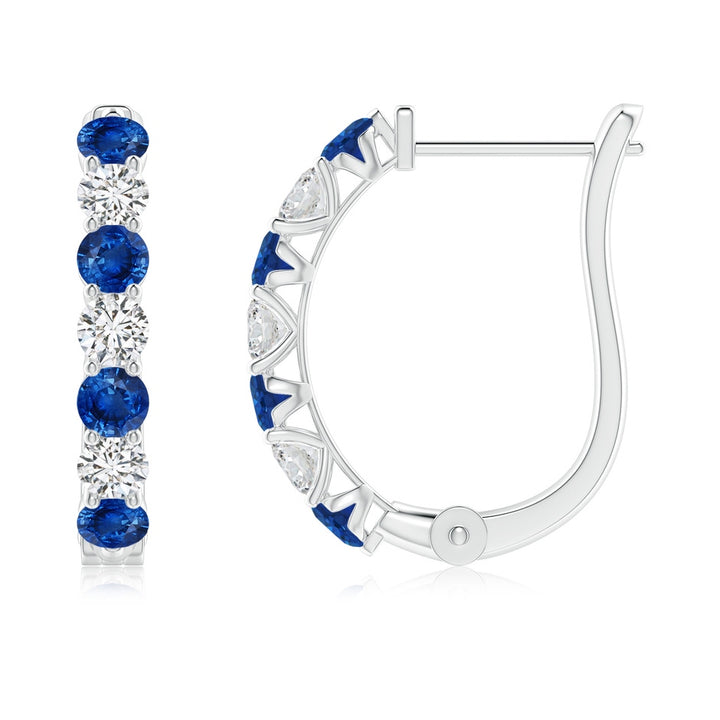 These Prong-Set Blue Sapphire and Diamond Huggie Hoop Earrings by Angara showcase a striking contrast of deep blue AAA heated round sapphires and dazzling diamonds. Crafted in 14k white gold, the stones are prong set alternately along the hoops, which secure comfortably with hinged clip closures. These elegant huggie hoops are perfect for adding subtle yet captivating color and sparkle to any look.