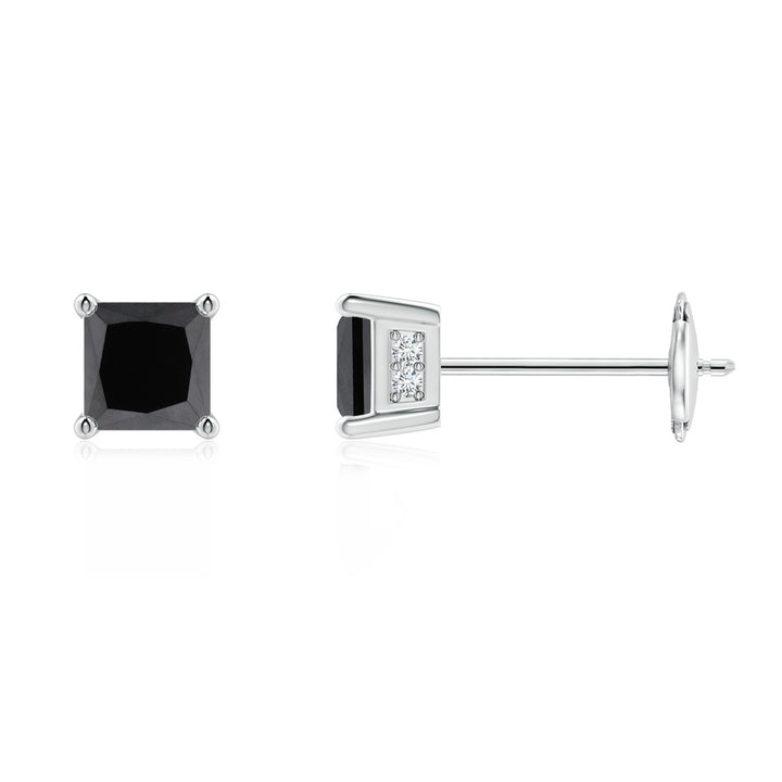 These Prong-Set Princess-Cut Enhanced Black Diamond Solitaire Stud Earrings by Angara make a bold and sophisticated statement. The princess-cut irradiated black diamonds are secured in white diamond-accented baskets crafted in 14k white gold, combining edgy allure with classic elegance for a versatile wardrobe essential.