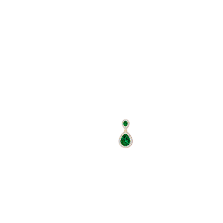 Crafted in 14k yellow gold. Features 2 pear-shaped lab-grown emeralds, approx. 9x7mm each, totaling 3.00 carats, prong set. Accented with 2 oval lab-grown diamonds, approx. 4x3mm each, totaling 0.24 carats, prong set. Surrounding halo of round lab-grown diamonds.