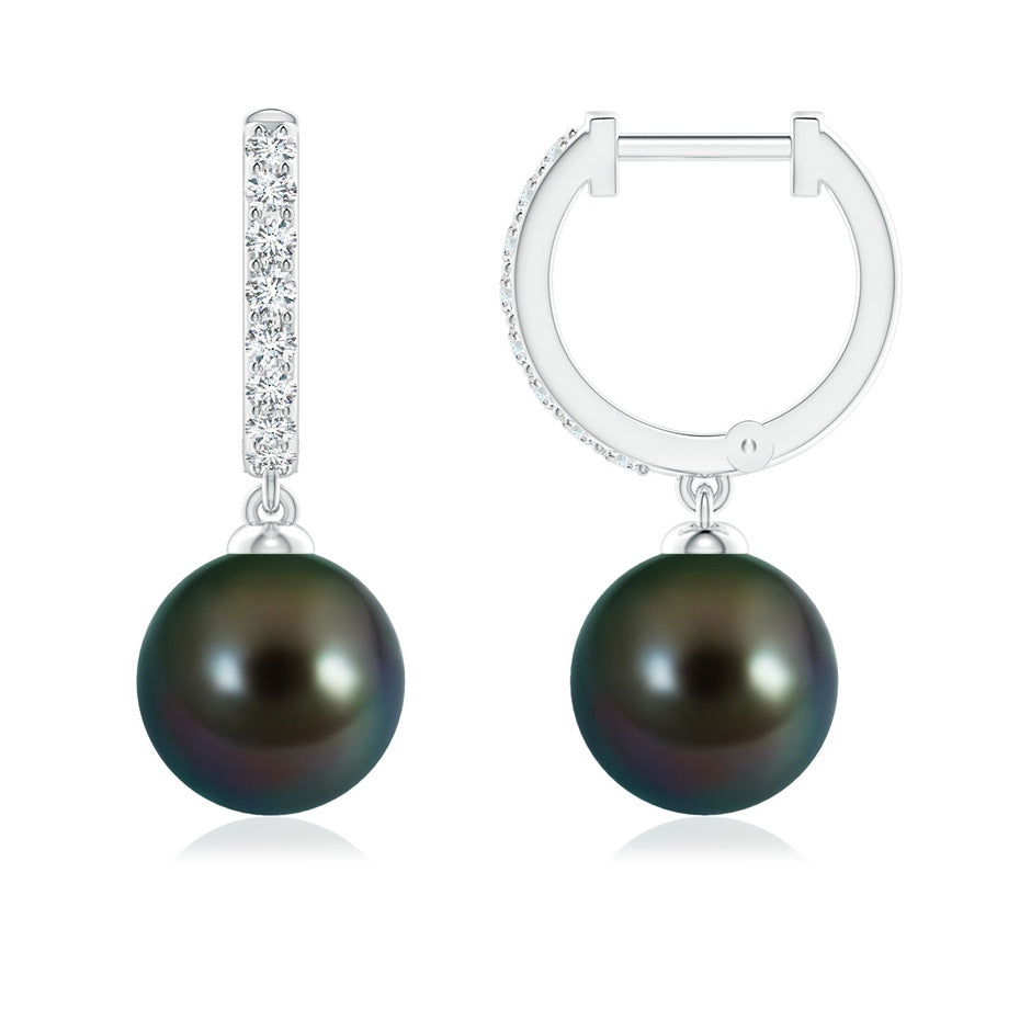 Made in 14k white gold. Features two 8mm AAAA Tahitian cultured pearls, peg set, no enhancement. Accented with 16 round diamonds totaling 0.19 ct, G-H VS grade, prong setting.