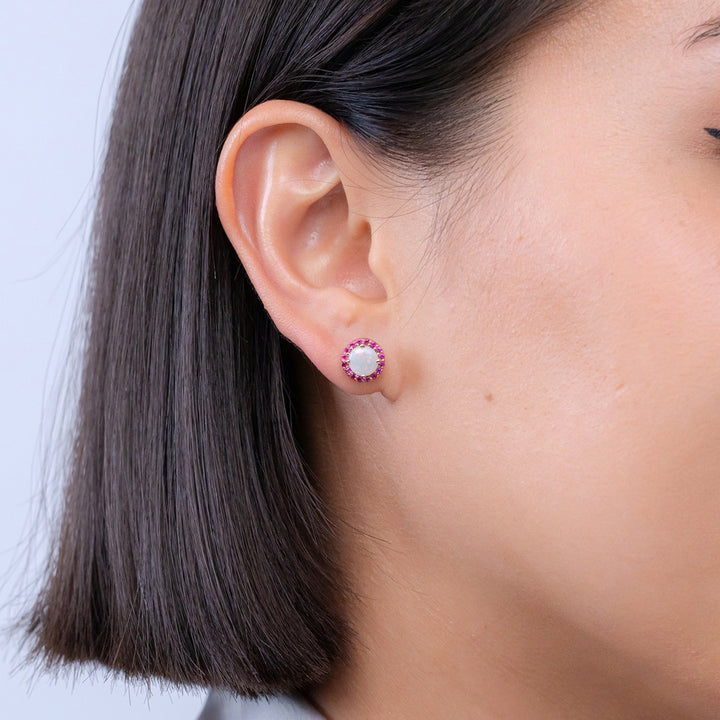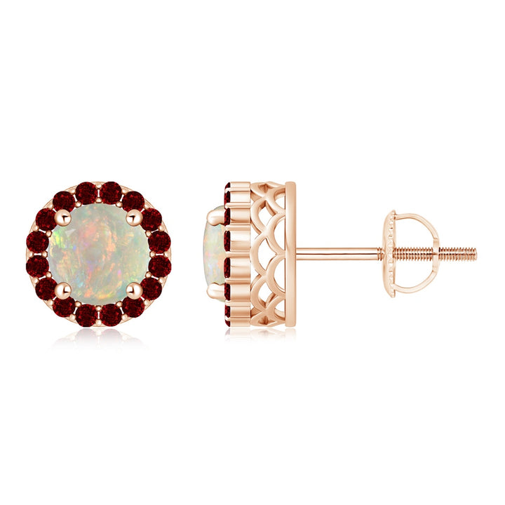 Crafted in 14k rose gold with two prong-set round opals measuring approximately 6mm each (AAAA quality, no enhancement). Surrounding each opal are 32 prong-set round rubies totaling 0.22 carats (AAAA quality, heated enhancement). Backed with secure push backs.