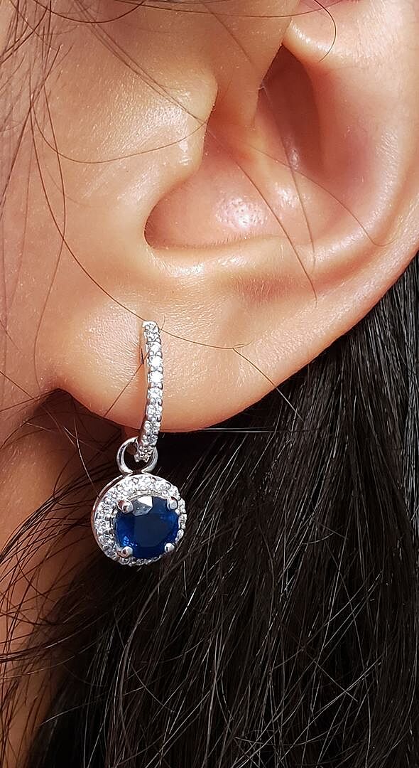 Round Blue Sapphire Dangle Earrings with Diamond Halo
