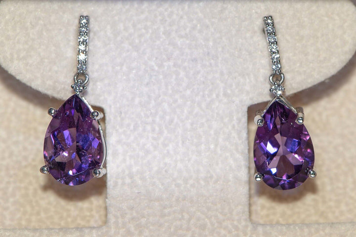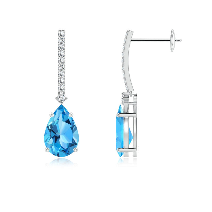 These Solitaire Pear Swiss Blue Topaz Drop Earrings with Diamonds by Angara dazzle with pear-shaped Swiss blue topaz stones set in four-prong settings, accented by brilliant round station diamonds and shimmering diamond details on the stems. Crafted in 14K white gold, these earrings capture vibrant color and refined sparkle for everyday elegance or special occasions.