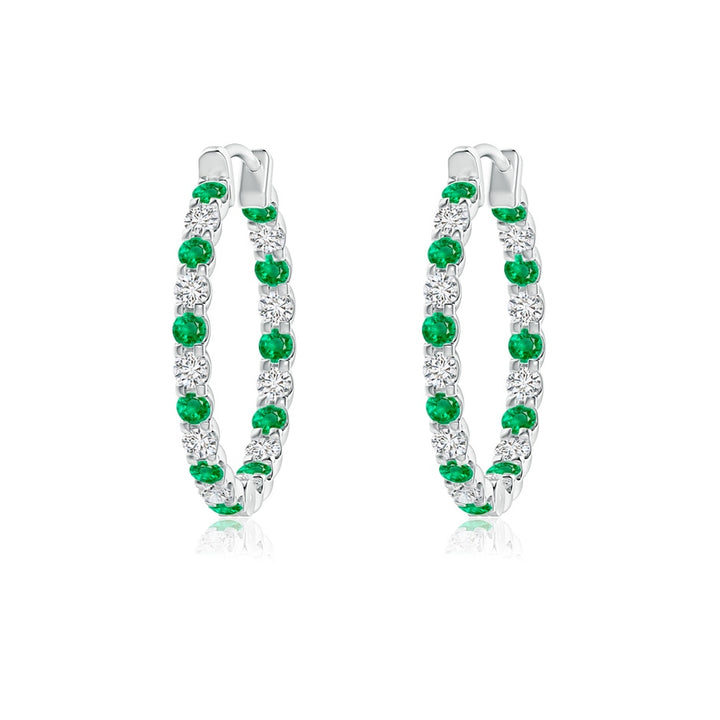 Style Notes: These Prong-Set Round Emerald and Diamond Inside Out Hoop Earrings by Angara are a dazzling statement of contrast and craftsmanship. Emeralds and diamonds alternate around the outside and inside of 14k white gold hoops, creating a captivating view from every angle. The rich green hues of the emeralds beautifully complement the sparkling diamonds, making these hoops a luxurious choice for those who appreciate unique, versatile designs.