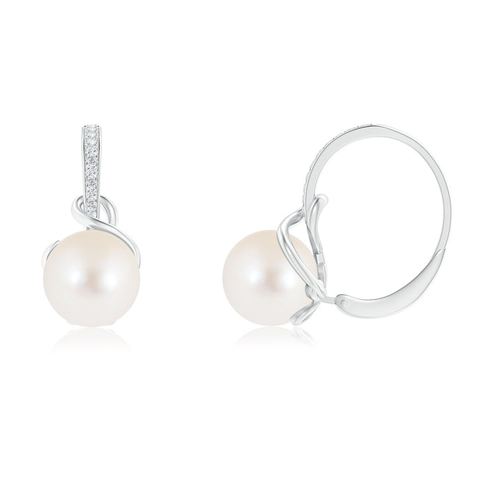These Solitaire Freshwater Pearl Leverback Earrings by Angara are a timeless addition to any jewelry collection. Each earring features a round 8mm freshwater cultured pearl delicately embraced by a metal strand from the leverback clasp, accented with pavé-set diamonds that add subtle sparkle. Crafted in 14k white gold, these earrings offer elegance and versatility for everyday wear or special occasions.