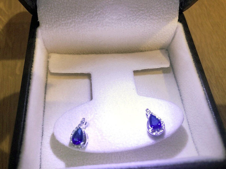 Crafted in 14k white gold, featuring 2 pear-shaped heated blue sapphires (AAA quality) approximately 6x4 mm each, total weight 0.80 ct, framed by 22 round diamonds (H SI2) totaling 0.14 ct in U pavé settings. Total earrings carat weight 0.94 ct.