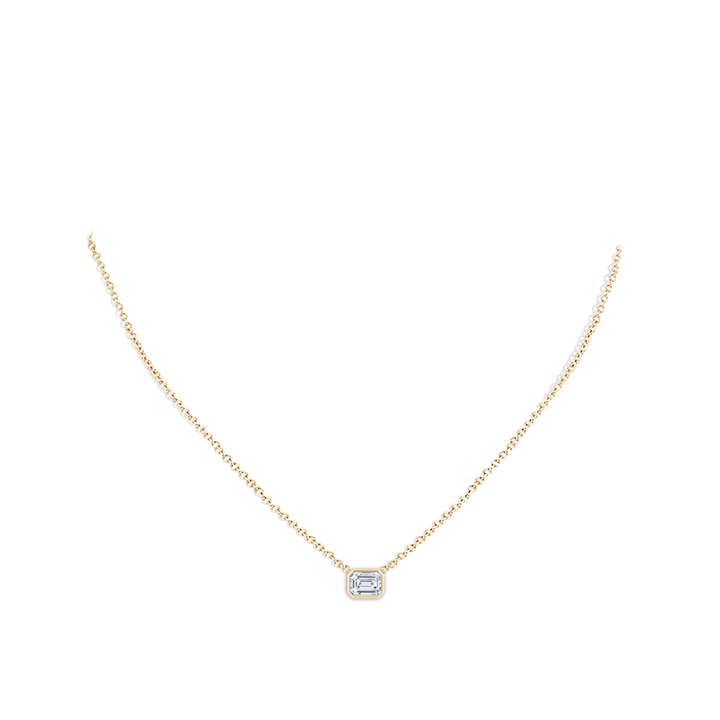 This Lab-Grown East-West Bezel-Set Emerald-Cut Diamond Pendant by Angara offers a sleek and sophisticated silhouette. Featuring a horizontally mounted emerald-cut lab-grown diamond in a clean bezel setting, this 14k yellow gold pendant is the epitome of minimalist luxury. Ideal for layering or making a statement on its own.