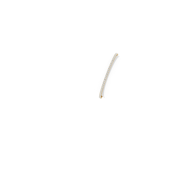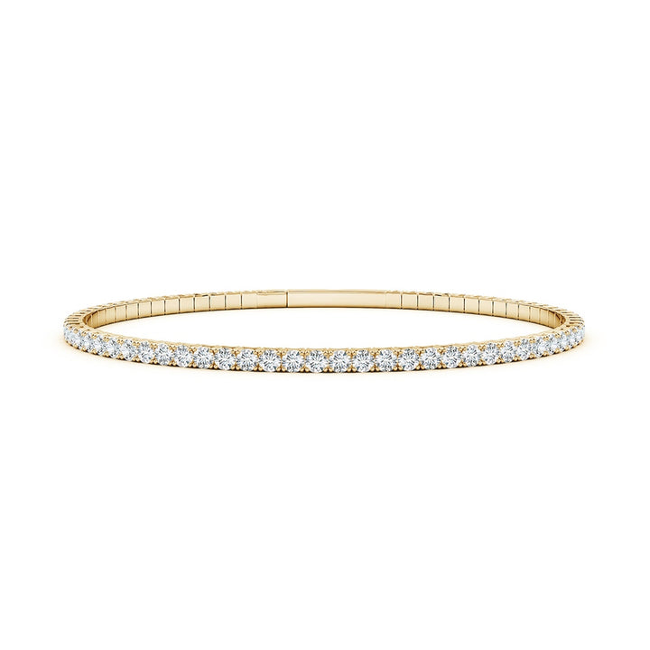 This Classic Round Lab-Grown Diamond Flex Bangle by Angara in 14K yellow gold radiates with continuous prong-set round lab-grown diamonds. A timeless flex design offers both comfort and brilliance, making it an essential accessory for layering or solo wear. The 2.31 total carat weight diamonds boast F-G color and VS clarity for lasting sparkle.