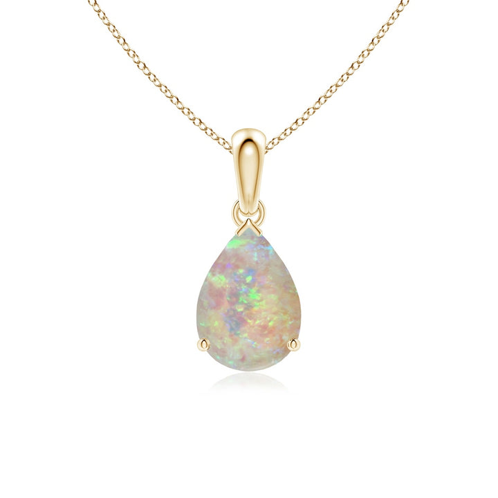 This Prong-Set Pear Opal Solitaire Pendant by Angara captivates with its mysterious play of colors. The lustrous pear-shaped opal is prong set and hangs gracefully from a single bale crafted in 14k yellow gold, combining elegance and ethereal beauty.