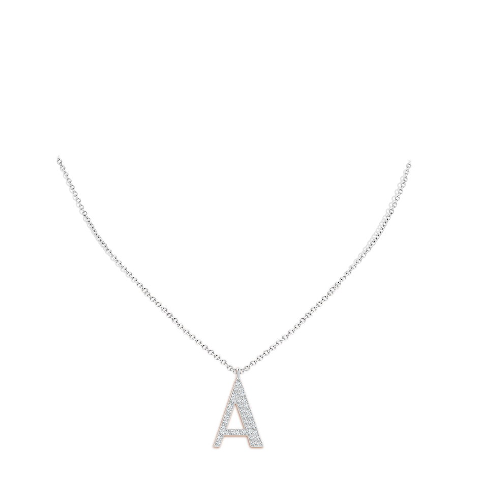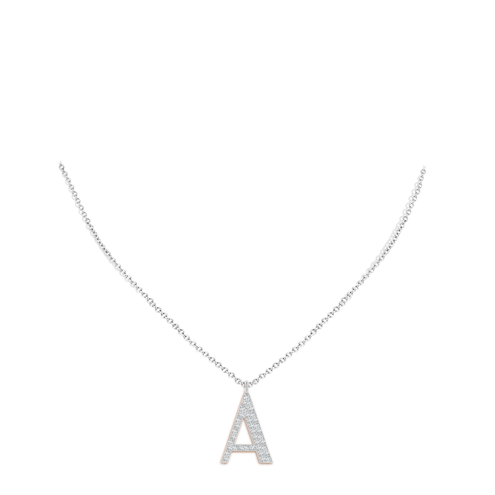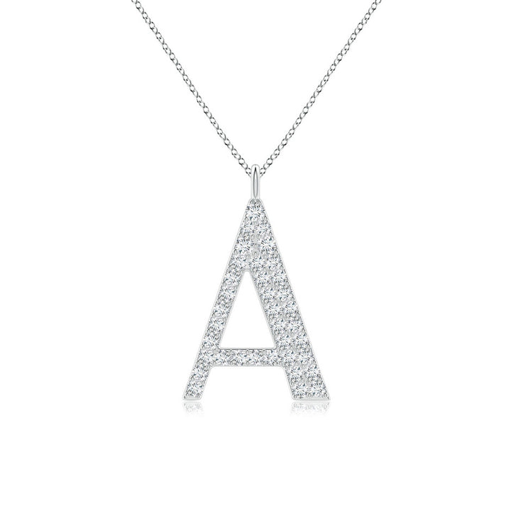 This Modern Deco Diamond Capital 'A' Initial Pendant by Angara is a striking expression of individuality and elegance. Set in platinum, the capital letter 'A' is adorned with 36 sparkling round diamonds, prong-set to maximize brilliance. The pendant hangs from a chain via dual jump rings, creating a contemporary yet timeless design that celebrates personal identity with luxurious sparkle.