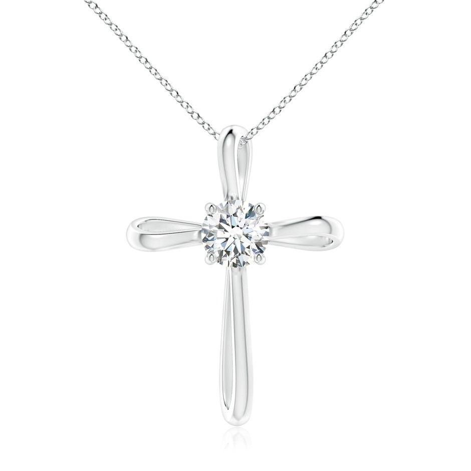 This Prong-Set Round Lab-Grown Diamond Ribbon Twist Cross Pendant by Angara is a modern expression of faith. The 14k white gold cross features a graceful ribbon twist design with a solitaire lab-grown diamond prong set at its center, radiating subtle brilliance and refined elegance.