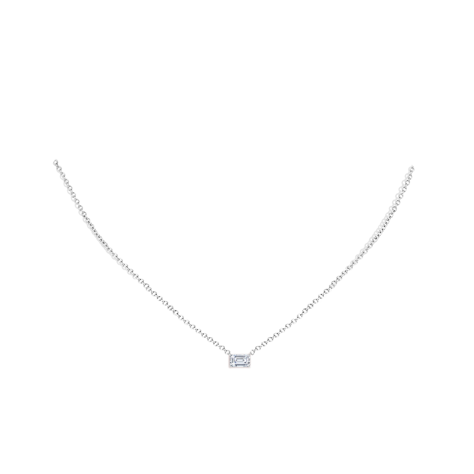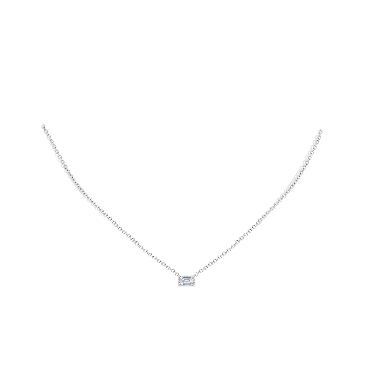 This East-West Emerald-Cut Lab-Grown Diamond Solitaire Pendant by Angara offers a contemporary twist on classic elegance. The 18k white gold pendant features a horizontally mounted emerald-cut lab-grown diamond prong set for a captivating display of brilliance.