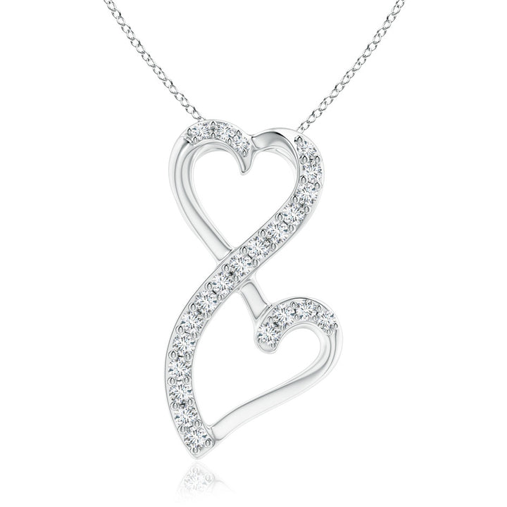 The Diamond Double Heart Infinity Pendant by Angara beautifully symbolizes endless love. Crafted in 14k white gold, two prong-set diamond-encrusted hearts intertwine in an elegant infinity design, sparkling with 22 round G color, VS2 clarity diamonds.