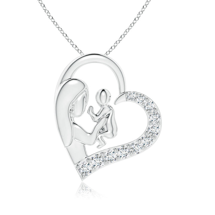 This Diamond Heart Mother & Baby Pendant by Angara is a tender and heartfelt symbol of maternal love. Crafted in platinum, the asymmetrical heart frame artistically depicts a mom and baby motif, partially adorned with eleven prong-set diamonds that shimmer softly, evoking warmth and connection. A beautiful keepsake that celebrates the bond between mother and child with elegant sparkle and meaningful design.