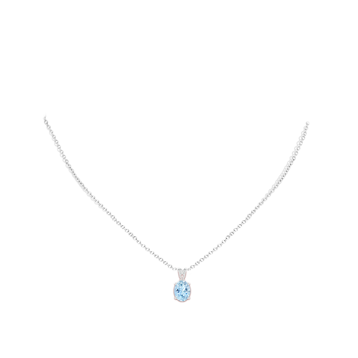 This Vintage Inspired Solitaire Oval Aquamarine Pendant by Angara showcases a sea-blue oval aquamarine linked to a unique V-bale. The intricate cutwork detailing on the sides enhances the pendant’s vintage charm, making it a refined and timeless accessory designed in 14k white gold.