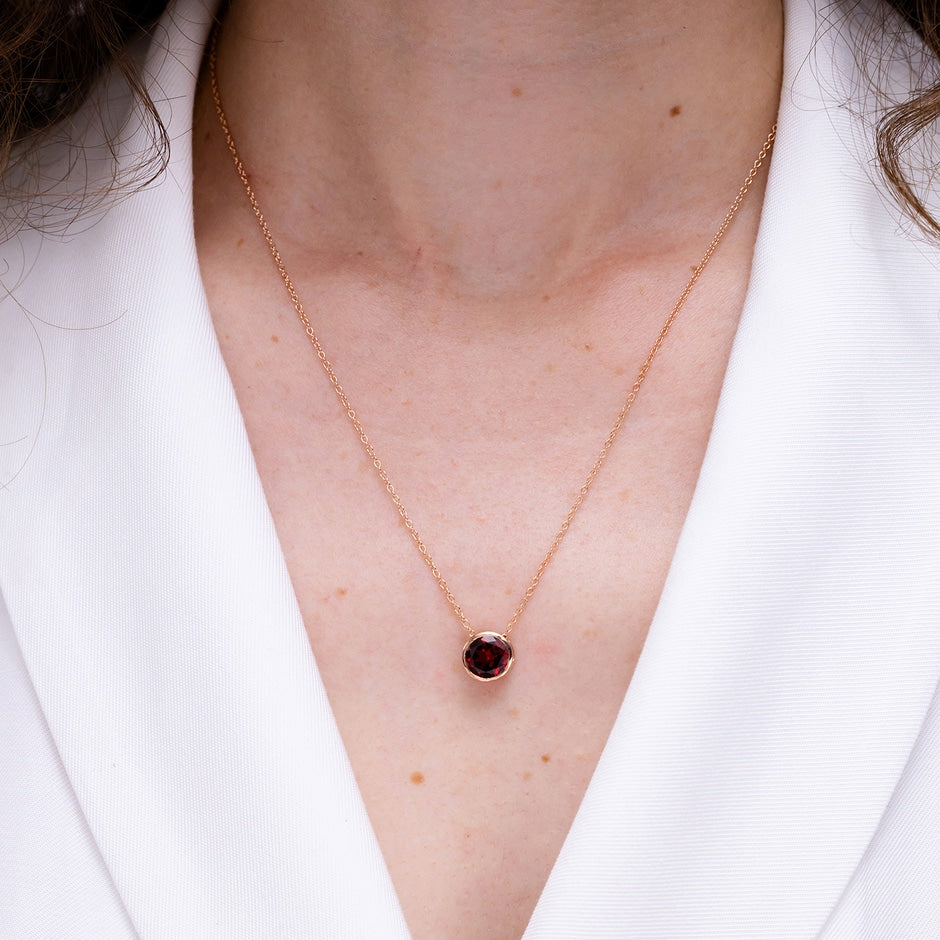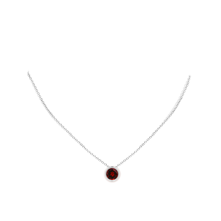 This Bezel-Set Round Garnet Solitaire Pendant by Angara offers a bold yet simple statement with its intense red round garnet that appears to float effortlessly on the chain. Set in 14k white gold bezel, this pendant is perfect for adding elegance and color to any outfit.
