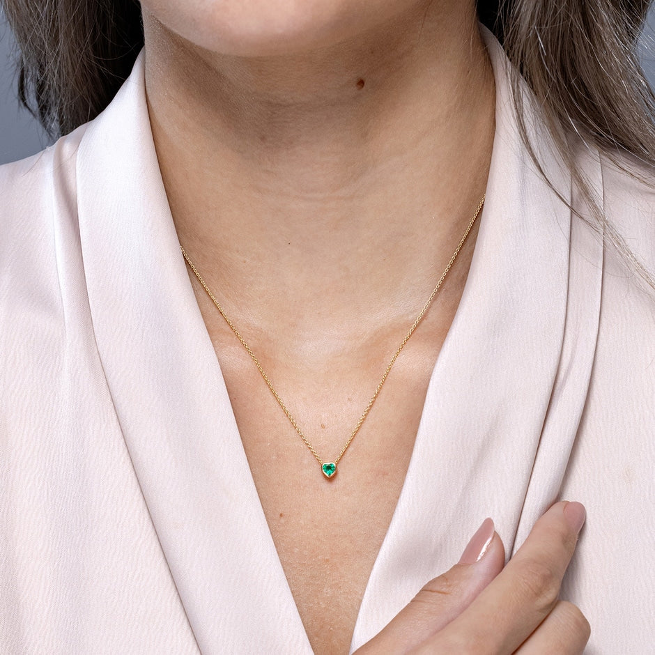 Materials: Crafted in 14k yellow gold with one heart-shaped emerald approximately 5mm, total carat weight 0.40 carats, oiled enhancement, AAAA quality, bezel setting. Available in white and rose gold, and platinum.