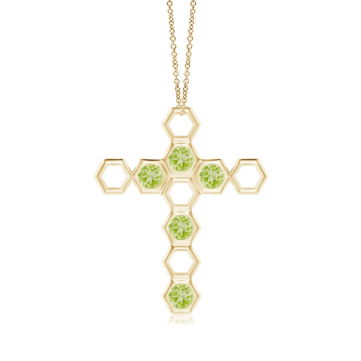 This Natori x Angara Hexagonal Alternate Peridot Cross Pendant features a unique design combining glossy hexagonal frames with alternately bezel-set olive-green peridots. Crafted in 14k yellow gold, it comes with an 18-inch adjustable rolo chain, making it a meaningful and versatile symbol of faith.