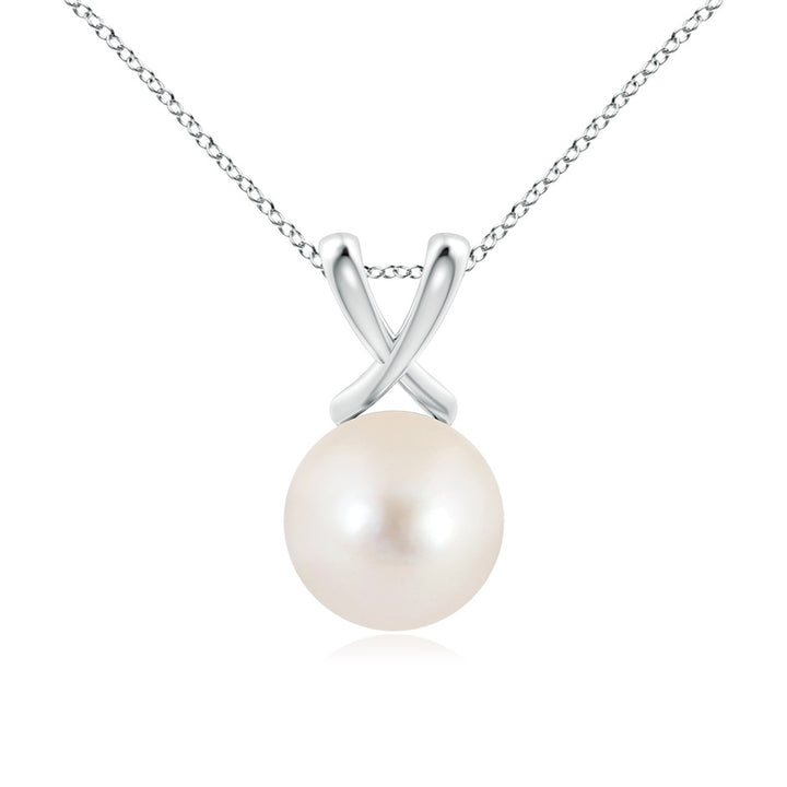 Crafted in 14k white gold with one AAAA quality freshwater cultured pearl approximately 10mm. Pearl features ultra-high luster and very thick nacre. Peg setting on cross V-bale.