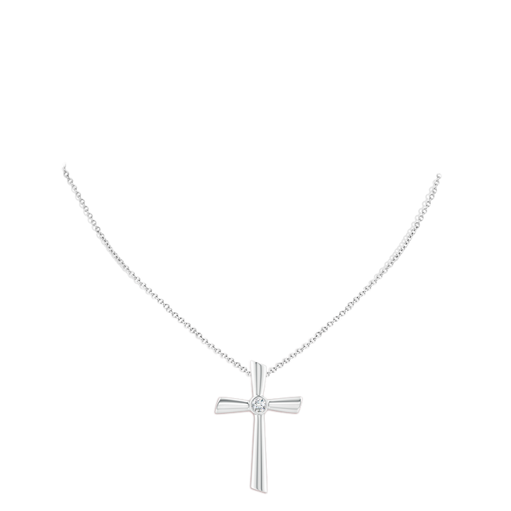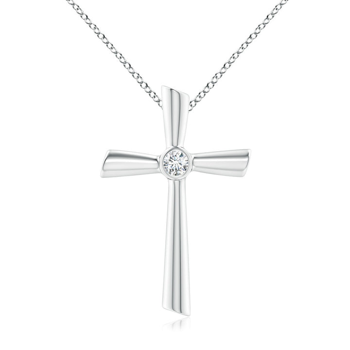 This Bezel-Set Solitaire Round Diamond Cross Pendant by Angara is a refined expression of faith. Designed in platinum, it features a solitaire round diamond set in a bezel setting, framed by polished grooves that amplify its brilliance.