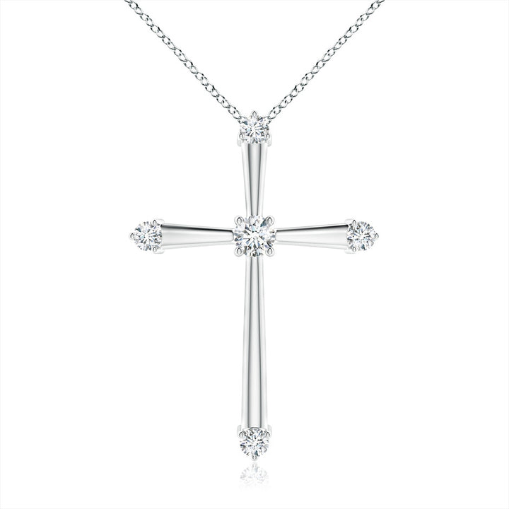 This Classic Diamond Budded Cross Pendant by Angara is a timeless emblem of faith and grace. Crafted in 18k white gold, it features five prong-set brilliant diamonds, including a central diamond and one at each arm’s tip, offering delicate sparkle and symbolic beauty.