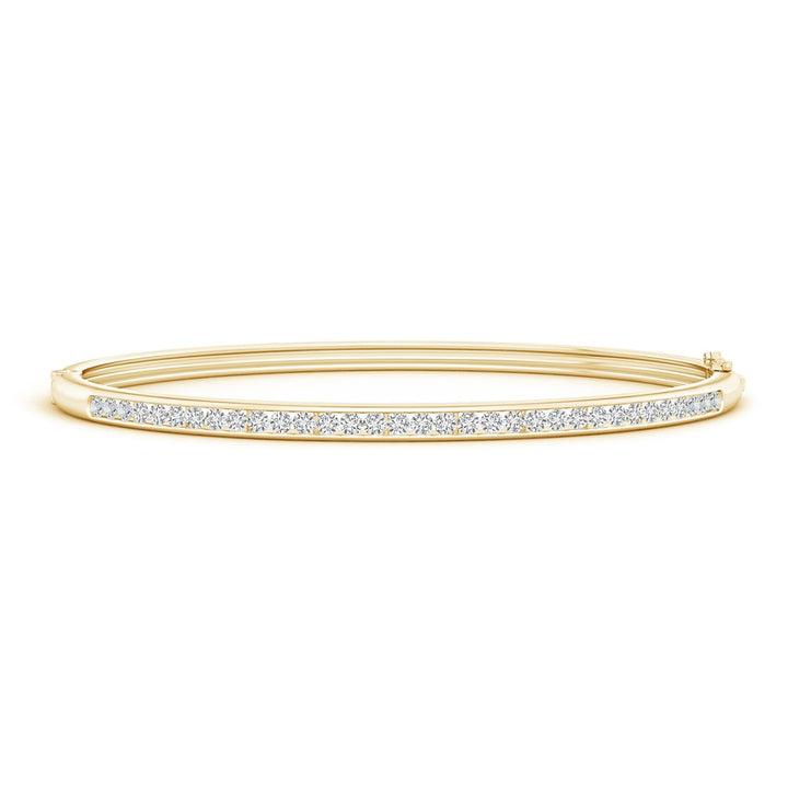 This Classic Channel-Set Round Diamond Bangle by Angara is crafted in lustrous 14k yellow gold and features thirty-three round diamonds channel set along the band. The hidden hinged clasp offers seamless style and secure fit.