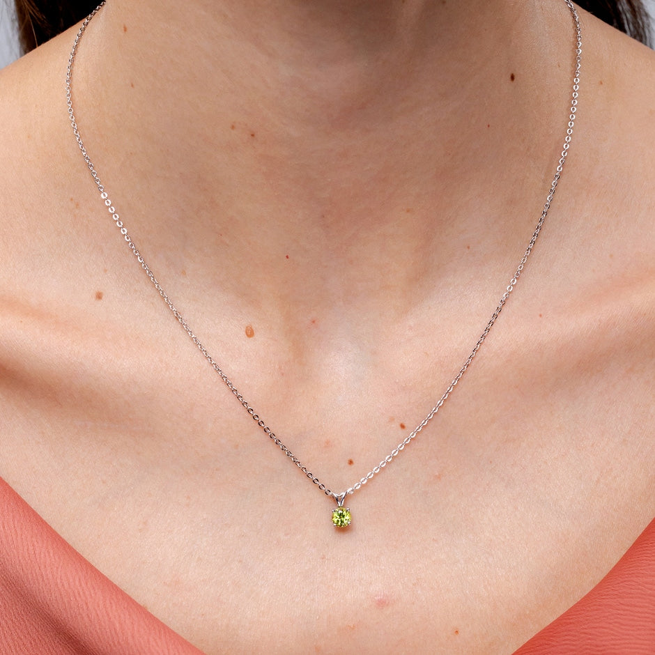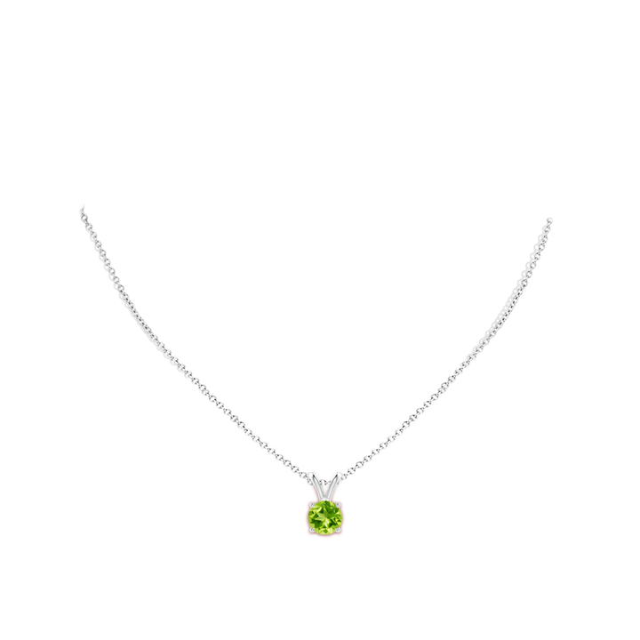 This V-Bale Round Peridot Solitaire Pendant by Angara showcases a captivating AAA quality round peridot prong set in 14k white gold. Suspended from a lustrous v-bale, the pendant exudes earthy elegance perfect for everyday wear.