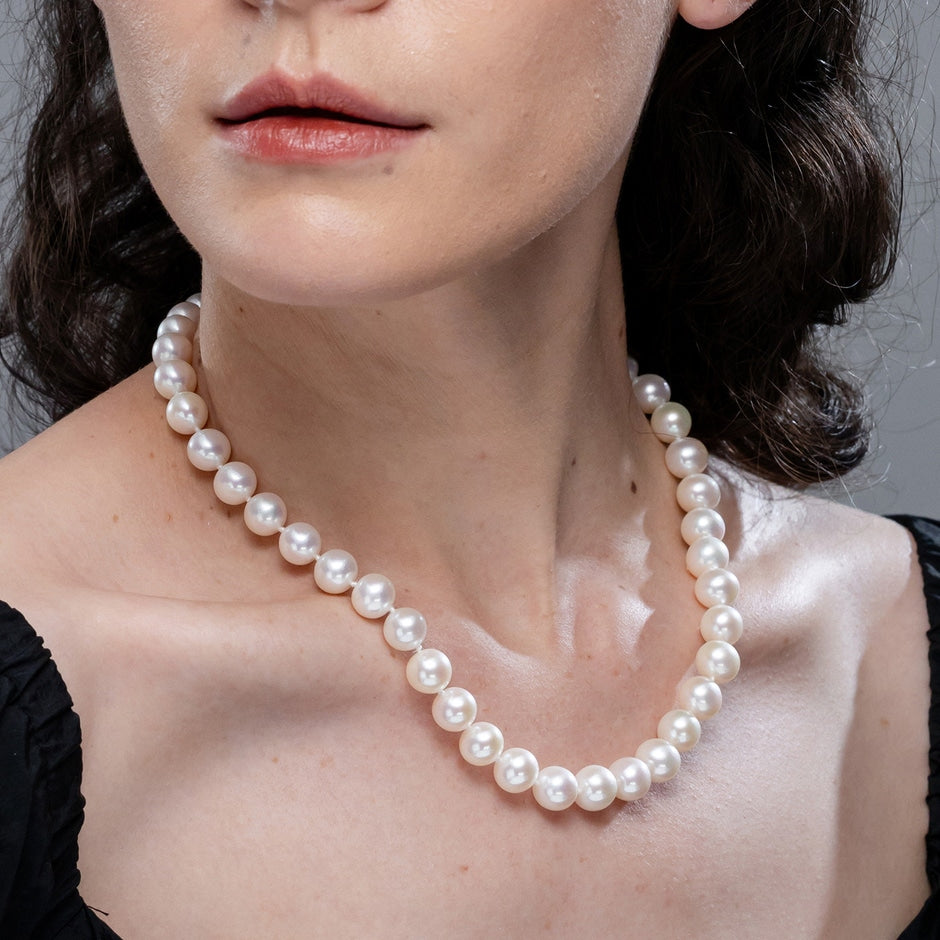 Handcrafted with AAA-grade freshwater cultured pearls, 10-11mm diameter each. 16-inch length. Double knotted on white silk. Clasp: 14k white gold ball clasp. Very high luster. Origin: China.