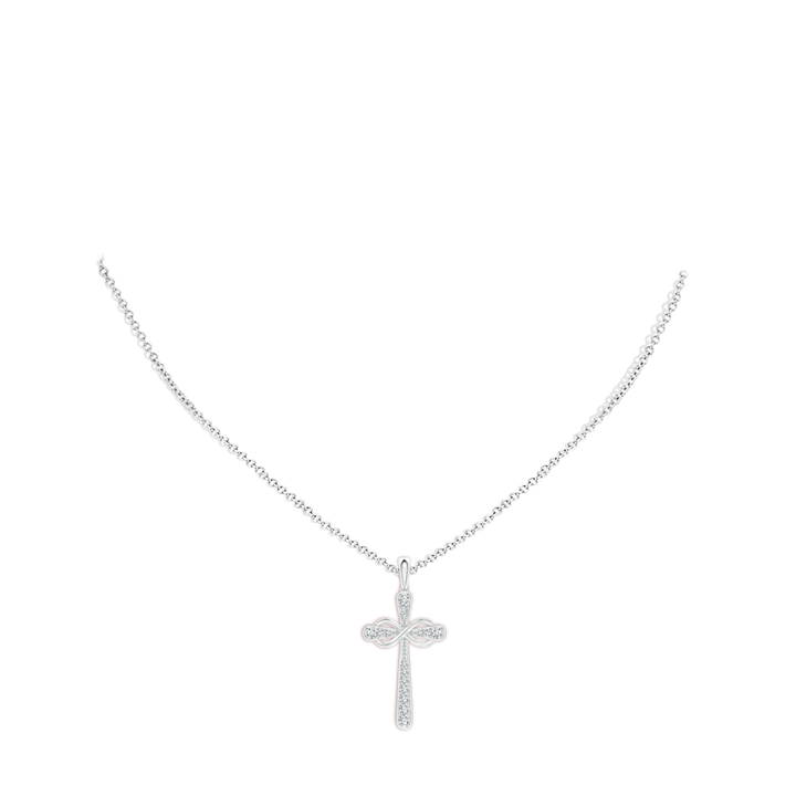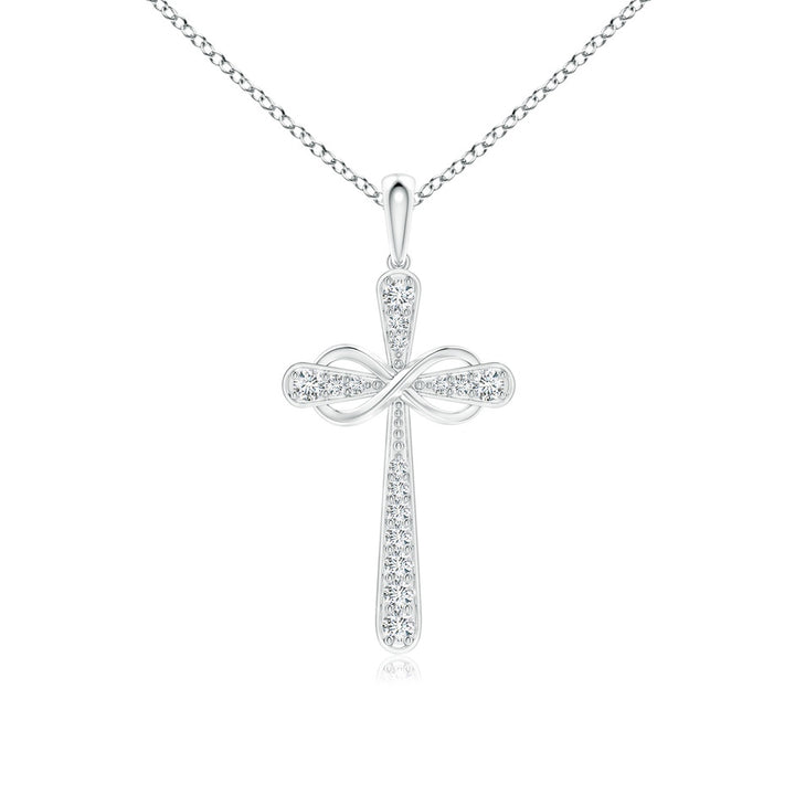 This Pavé-Set Diamond Cross and Sideways Infinity Pendant by Angara lets your faith shine through brilliant round diamonds set in pavé on a 14k white gold cross. The sideways infinity twist intertwined with the cross symbolizes endless love and grace, suspended on an 18-inch chain for a graceful finish.