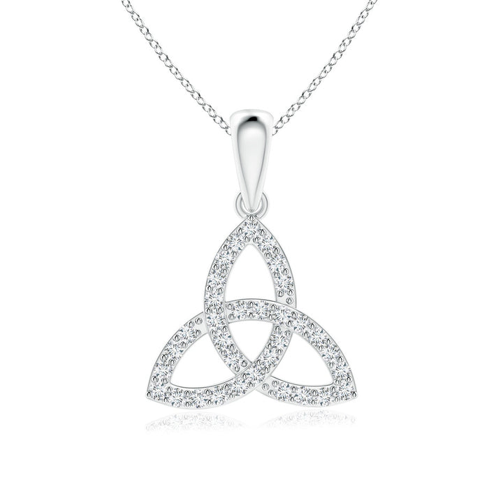 This Celtic Trinity Knot Diamond Pendant by Angara is a graceful expression of eternity and interconnectedness, shaped as a classic triquetra knot. Prong-set round diamonds shimmer across the pendant’s elegant curves, crafted in 14k white gold and suspended from a simple bale. The design evokes strength and unity, making it a meaningful symbol to cherish or gift.