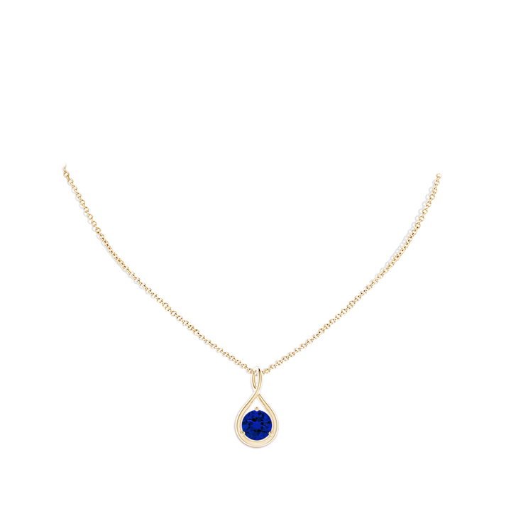 This Lab-Grown Solitaire Round Sapphire Infinity Twist Pendant by Angara exudes refined elegance, featuring a lab-grown round blue sapphire prong-set within a graceful infinity loop crafted in 14k yellow gold. The design symbolizes eternal love and limitless possibilities, perfect for those who appreciate ethical luxury and timeless style.