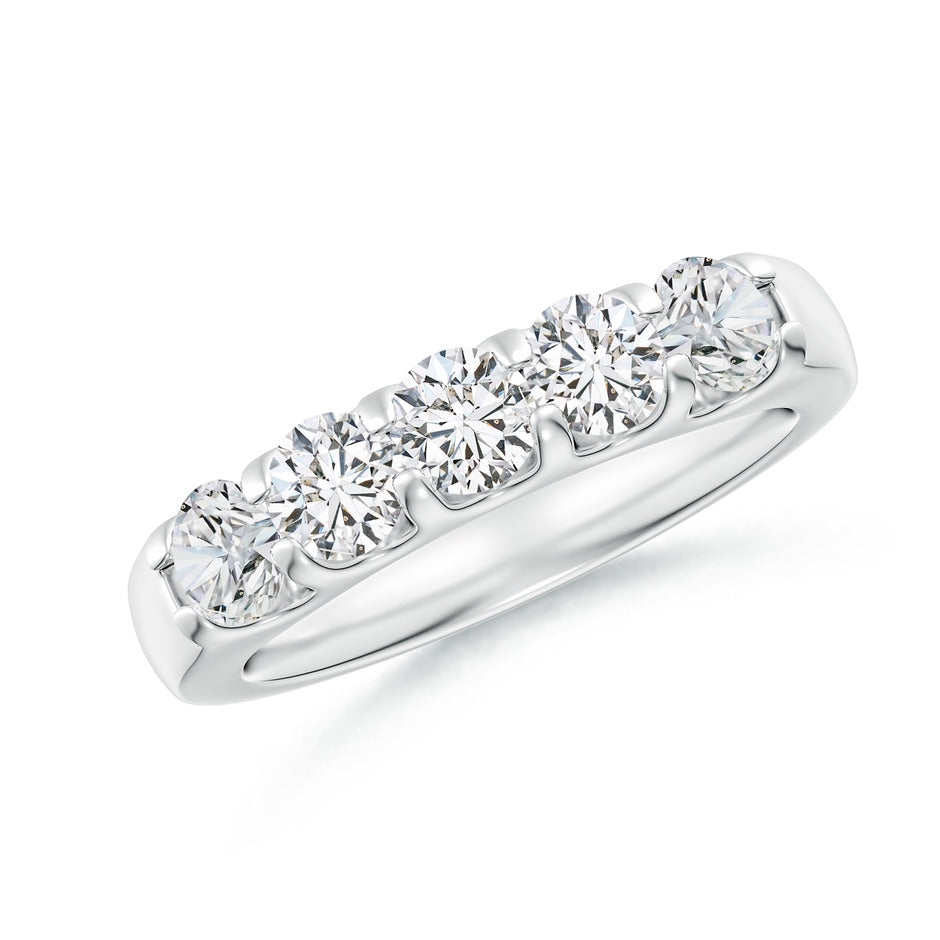 This Shared Prong Set Half Eternity Diamond Wedding Band by Angara embodies elegance and eternal love. The 14k white gold band features five prong-set diamonds in a sleek row, symbolizing a timeless commitment with refined sparkle.
