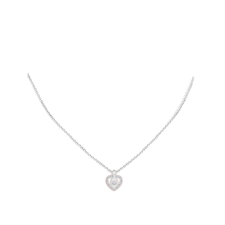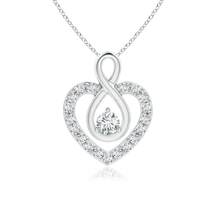 The Diamond Heart Pendant with Infinity Loop by Angara symbolizes everlasting love in 14k rose gold. Its open heart frame is adorned with prong-set G VS2 round diamonds, with additional diamond accents within the infinity loop, creating a scintillating and meaningful pendant. It hangs elegantly on an 18-inch chain, perfect for daily wear or special gifts.
