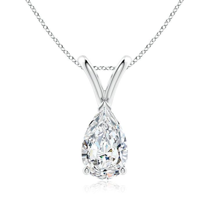 This Lab-Grown V-Bale Pear-Shaped Diamond Solitaire Pendant by Angara embodies minimalist elegance. A single pear-shaped lab-grown diamond, known for its exceptional brilliance, is prong set and suspended from a polished V-shaped bale in 14k white gold, making it a timeless and radiant pendant for everyday sophistication or special occasions.
