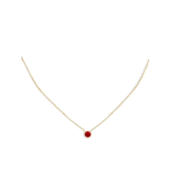 This Bezel-Set Round Ruby Solitaire Pendant by Angara presents a captivating purplish red ruby that appears to float gracefully on the chain. Set in a sleek bezel setting and crafted in 14k yellow gold, this classic pendant blends simplicity with vibrant color, making it an exquisite statement piece.