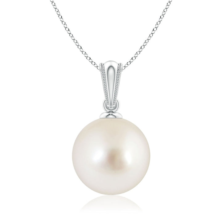 This South Sea Pearl Pendant with Ornate Bale by Angara exudes timeless elegance. The 9mm round South Sea cultured pearl, known for its ultra-high luster and very thick nacre, is complemented by a milgrain-accented 14k white gold bale, making this pendant a refined and luminous addition to any collection.