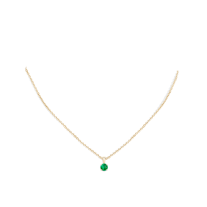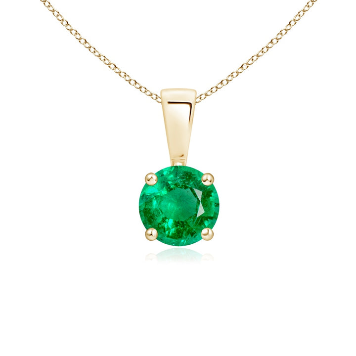 This Classic Prong-Set Round Emerald Solitaire Pendant by Angara highlights a lush 5mm round emerald secured in a four-prong setting. Crafted in 14k yellow gold, the pendant’s elegant design draws all attention to the vibrant center stone enhanced by oiling.