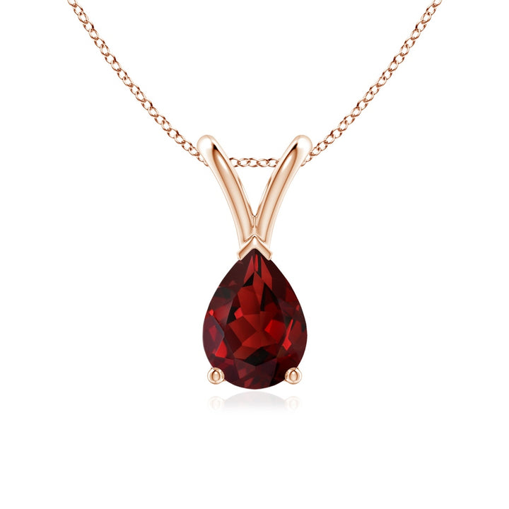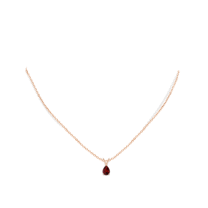 This V-Bale Pear-Shaped Garnet Solitaire Pendant by Angara embodies classic sophistication with a modern touch. The intense red pear-shaped garnet is secured by a three-prong setting and linked to a polished V-bale, crafted in 14k rose gold. Its elegant design and fiery color make it a timeless statement piece for any occasion.