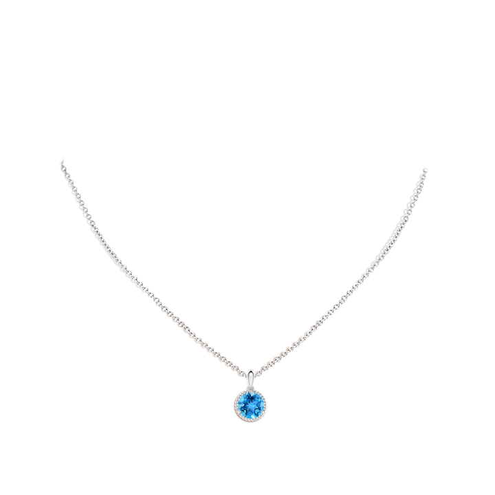 This Rope-Framed Claw-Set Swiss Blue Topaz Solitaire Pendant by Angara exudes simplicity with a touch of elegant detail. The 14k white gold pendant features a round heated and irradiated Swiss blue topaz securely claw prong-set and framed by a twisted rope design that adds a unique texture and classic charm to this striking solitaire.